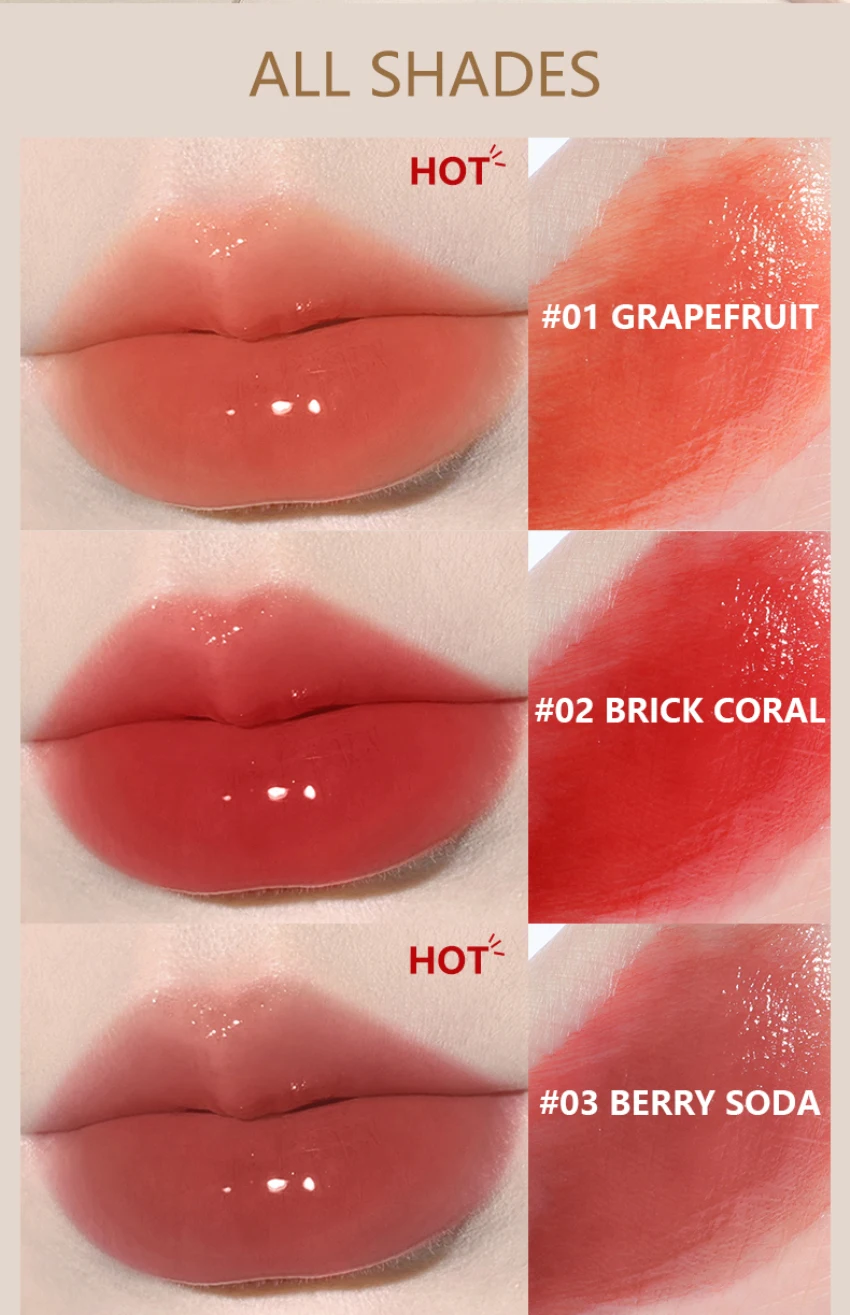 1.【Water glossy texture】Water glossy texture, clear, delicate and smooth, easy to apply, easy to create hydrating glass lip makeup.